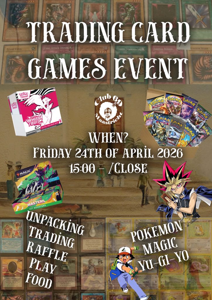 Vrijdag 24 april is er een TCG event in de Club69! Er word een Pokemon raffle gedaan, je kunt kaarten ruilen en een potje spelen. Tegen het einde van de dag wordt gezorgd voor een hapje!